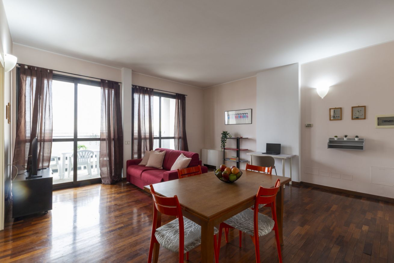 Il soggiorno, ampio e arioso, è arredato con un comodo divano-letto matrimoniale e una Smart TV da 43 pollici. Si affaccia direttamente sulla grande terrazza, accessibile anche da una delle due camere da letto.