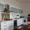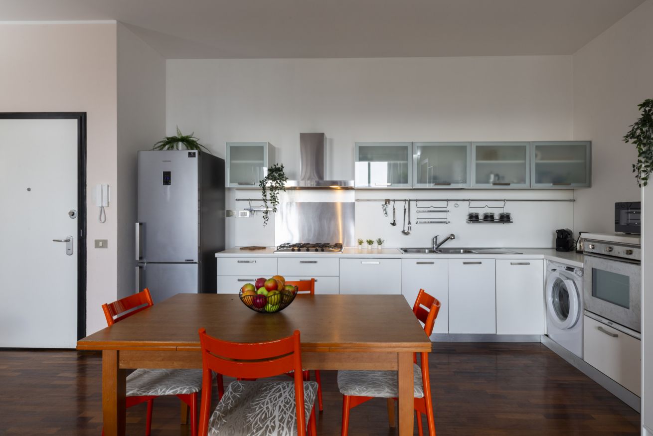 Piano a induzione, cappa aspirante, frigorifero con congelatore, forno tradizionale, lavastoviglie, microonde, bollitore elettrico, macchina da caffè Nespresso.