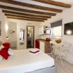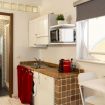 L’angolo cottura è completamente accessoriato con: piano cottura a induzione, mini-frigorifero, forno a microonde, bollitore elettrico, tostapane e macchina del caffè.