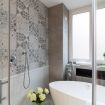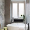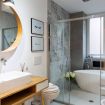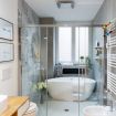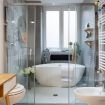 UNO splendido BAGNO dotato di servizi essenziali e cabina con bellissima vasca di design e doccia .