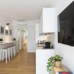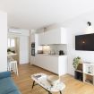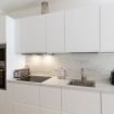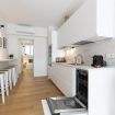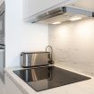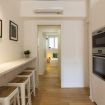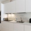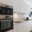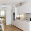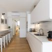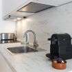 La cucina a vista è fornita di piano a induzione, cappa aspirante, frigorifero con freezer, lavastoviglie da 45cm, forno, microonde, bollitore elettrico, macchina del caffè Nespresso e tostapane.