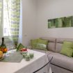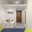 Presenti un tavolo per due persone e divano letto matrimoniale.
