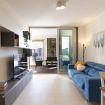 L'ingresso principale conduce direttamente al luminoso soggiorno, dotato di un comodo divano letto matrimoniale e un televisore Smart da 55 pollici.