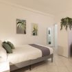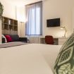 - CAMERA con letto matrimoniale alla francese, armadio, ampia scrivania, piccola libreria, divano a due sedute e Smart TV 32 pollici. Presente specchio a figura intera, comodini e finestra con affaccio interno.