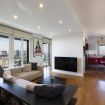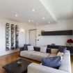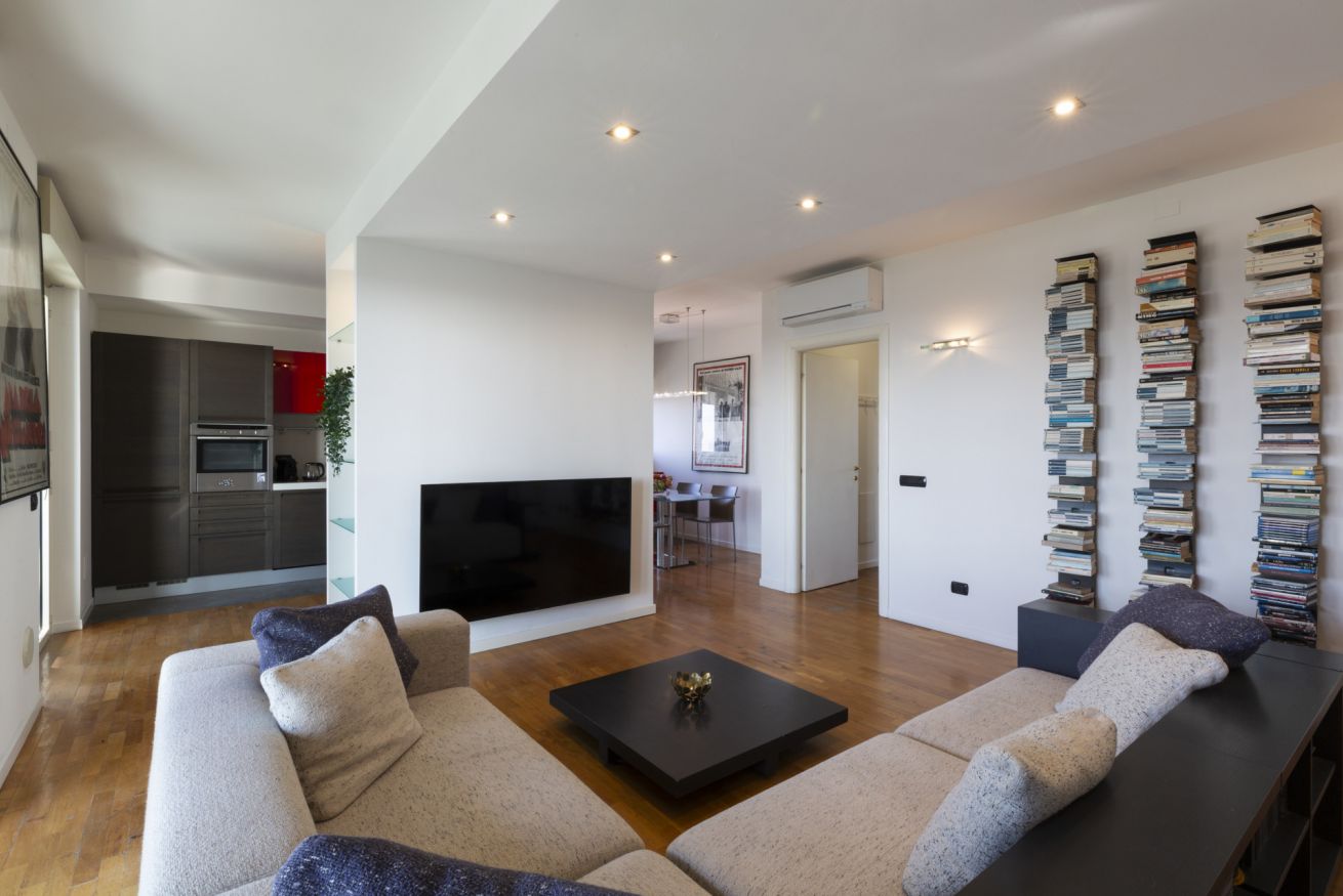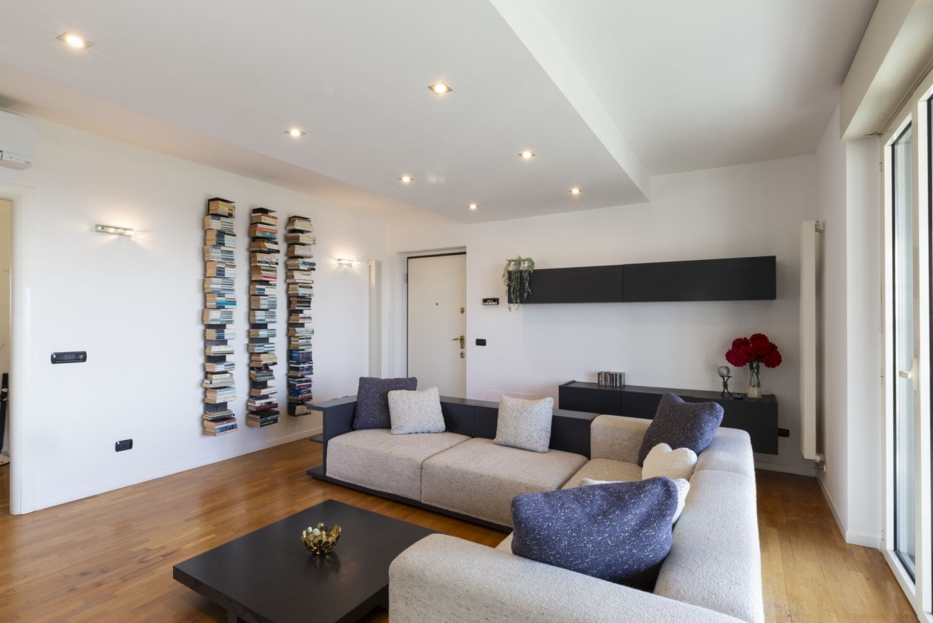 L’ingresso si apre su un luminoso soggiorno arredato con un grande divano angolare a 7 sedute e una Smart TV da 65 pollici. Presente libreria.