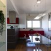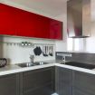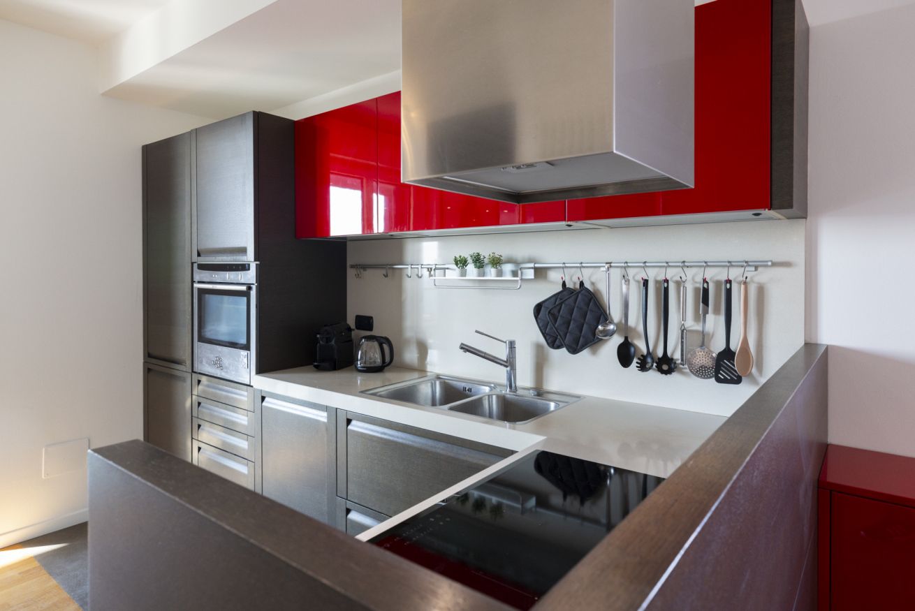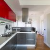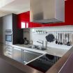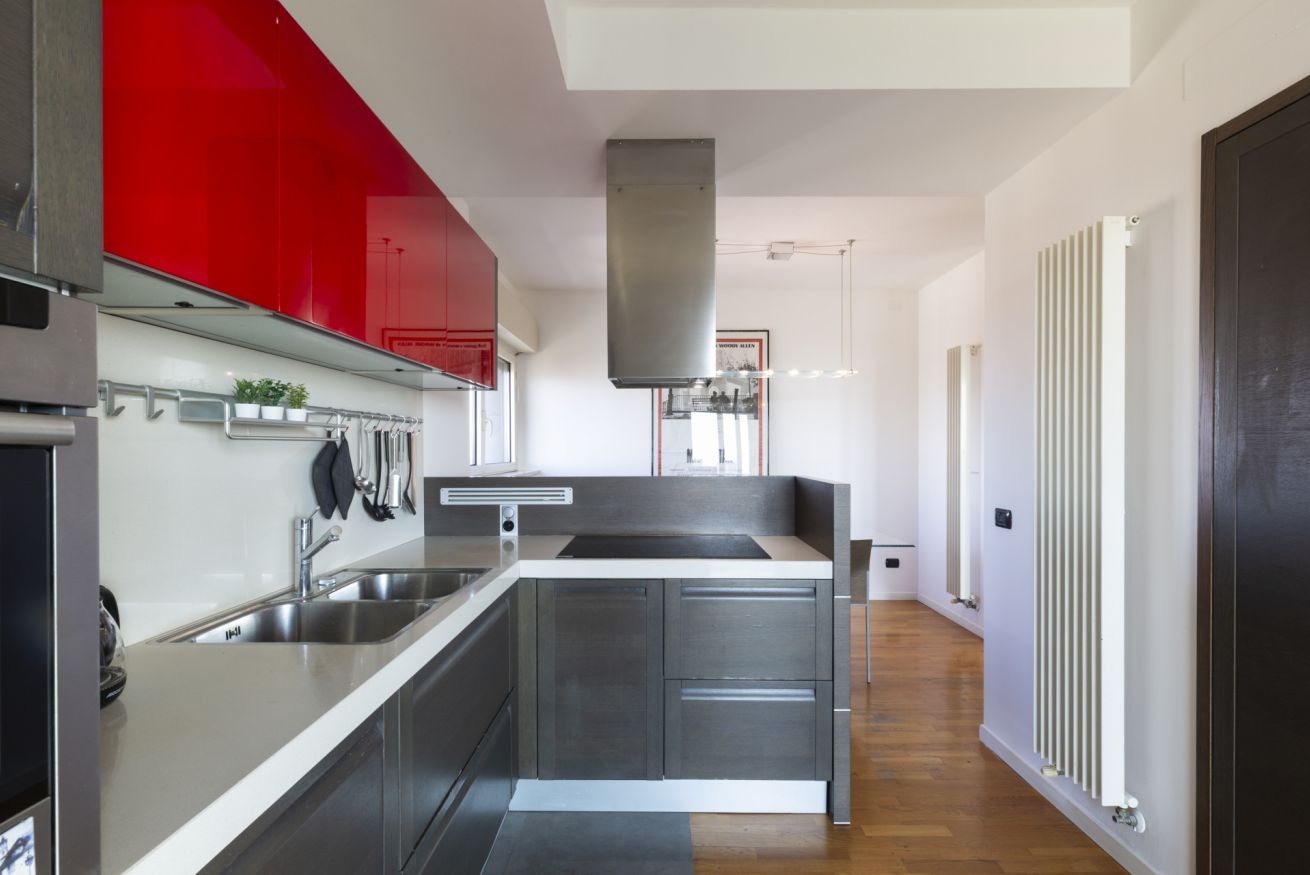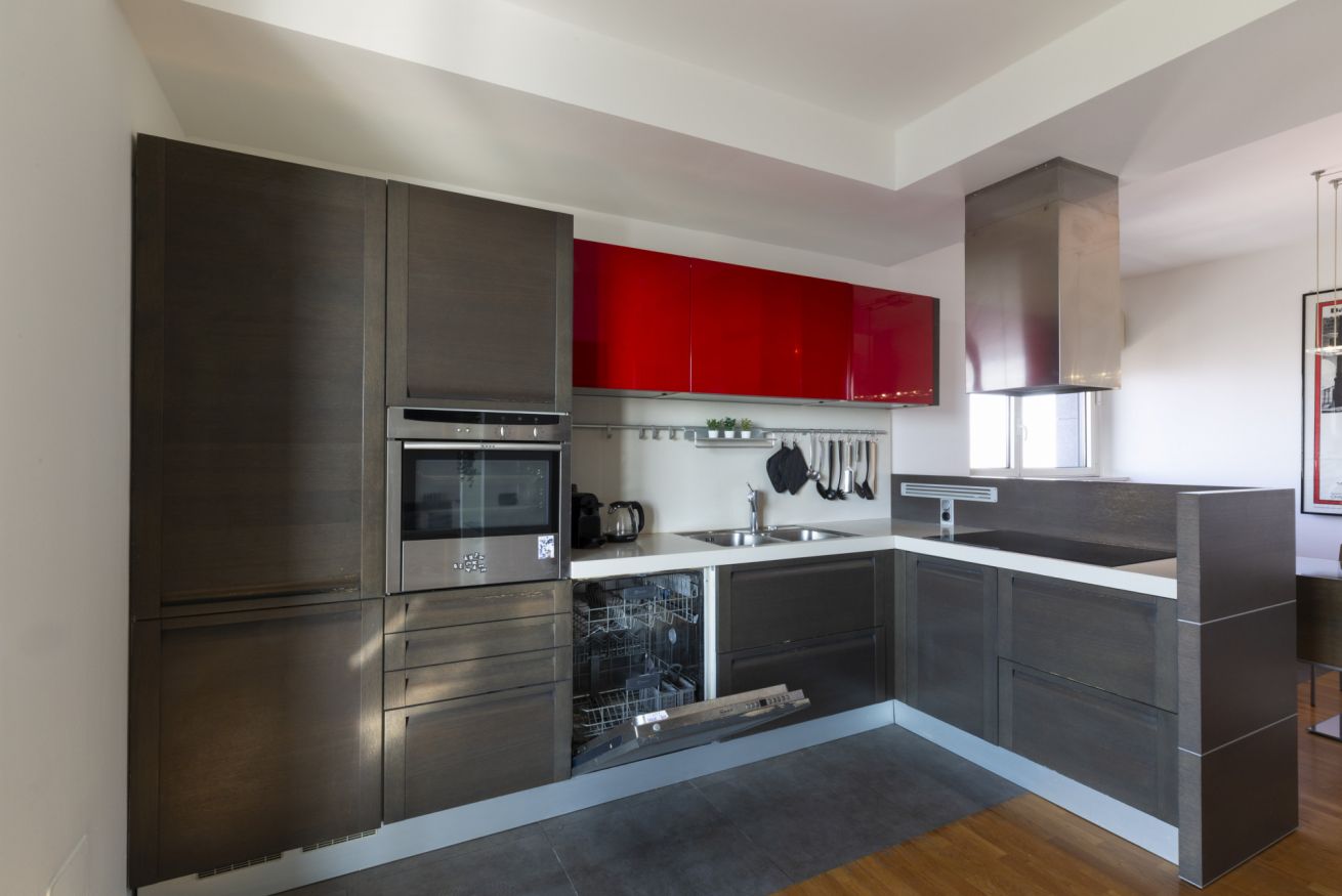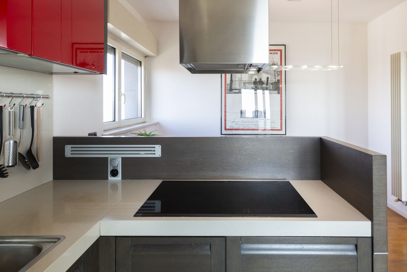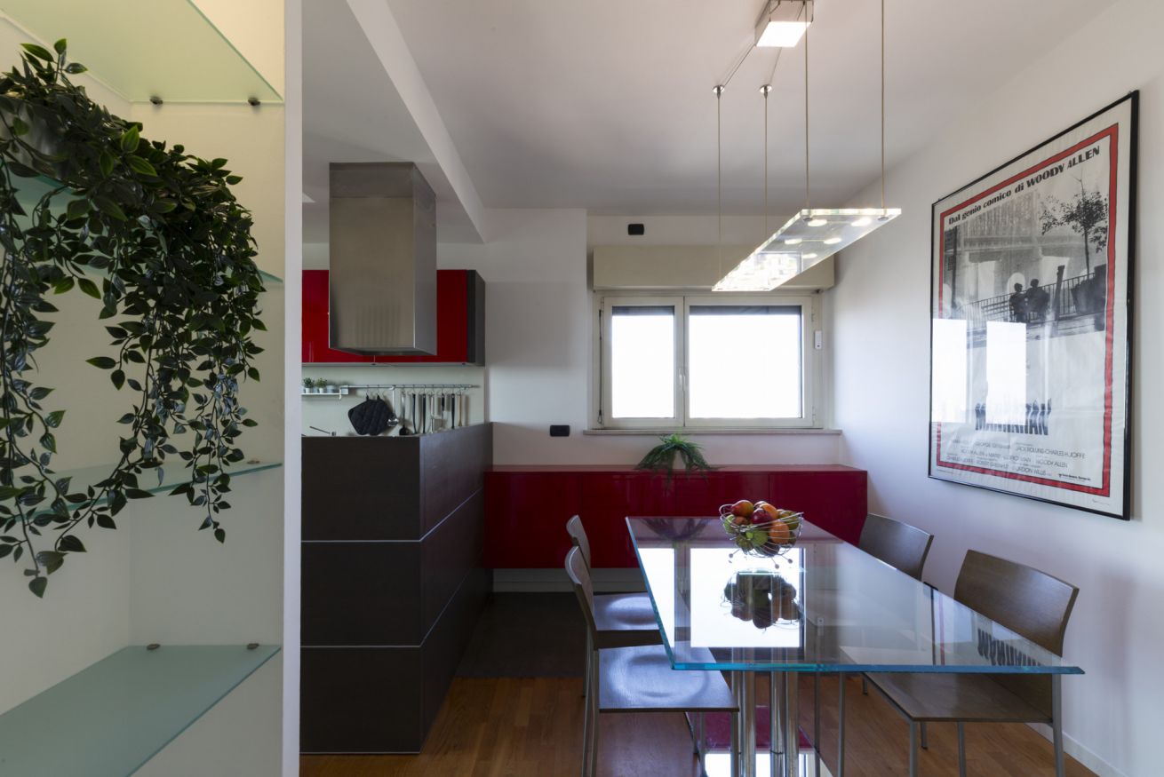 La cucina angolare a vista, moderna e completamente attrezzata, dispone di piano a induzione, cappa aspirante, frigorifero con freezer, forno, lavastoviglie, bollitore elettrico e macchina del caffè Nespresso. Un tavolo in vetro per quattro persone completa gli spazi della zona giorno. Dalla cucina si accede direttamente al terrazzo tramite una porta finestra.