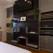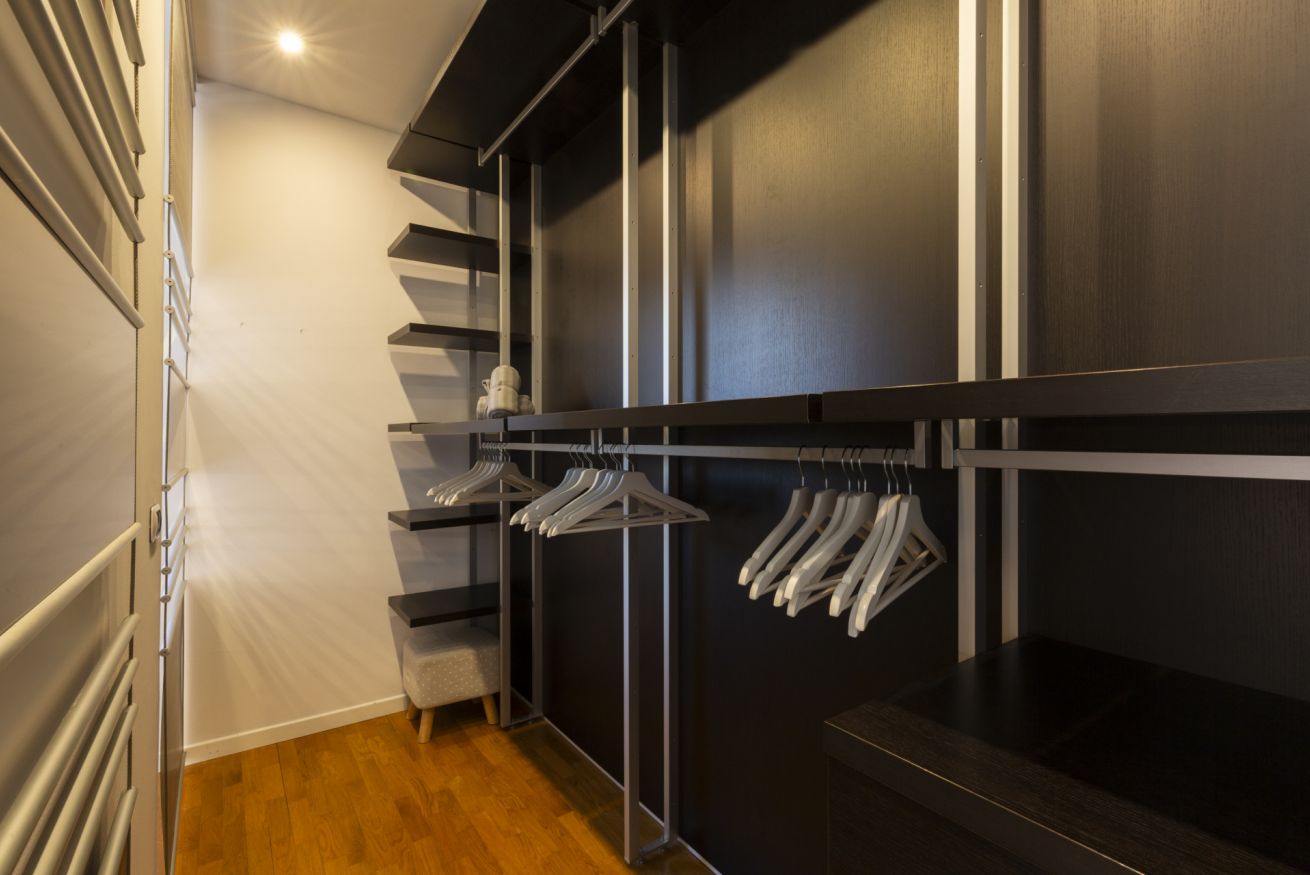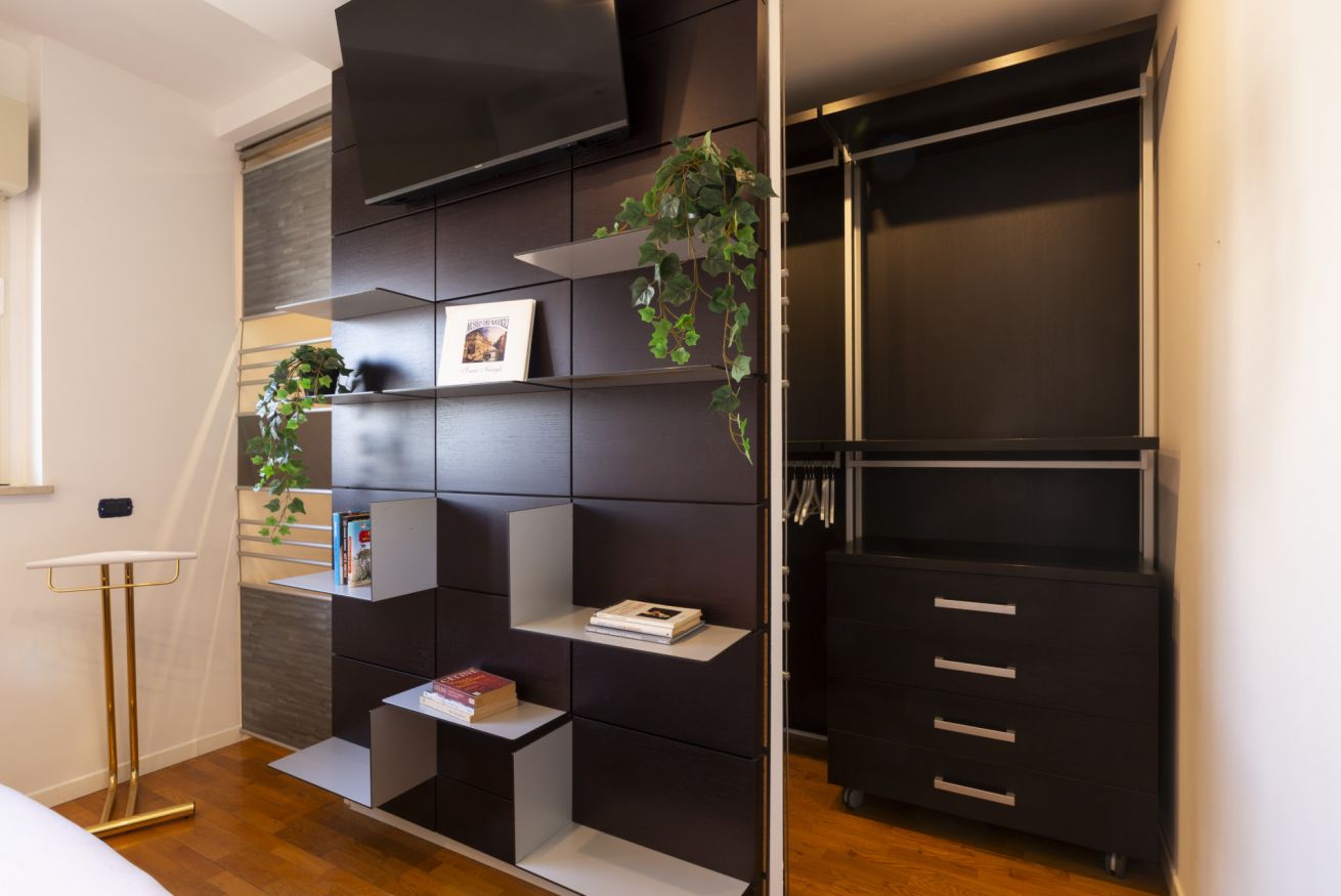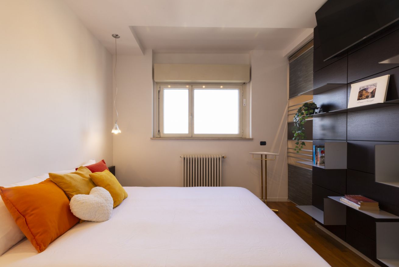 Prima camera: molto luminosa, dotata di letto matrimoniale, comodini con lampade sospese, Smart TV da 43", splendida cabina armadio e libreria a muro. La grande finestra offre una vista panoramica sulla città.
