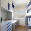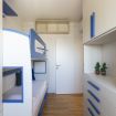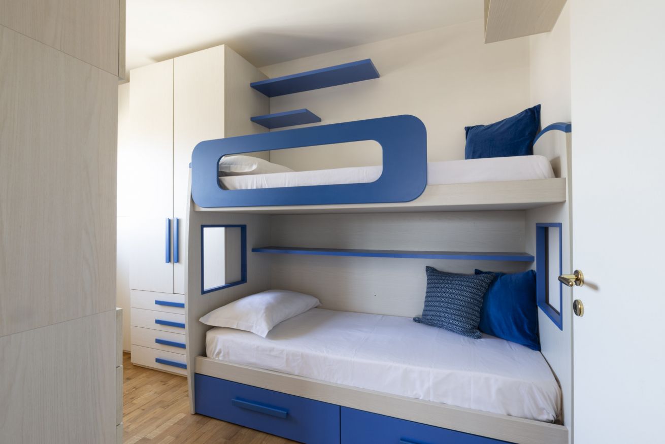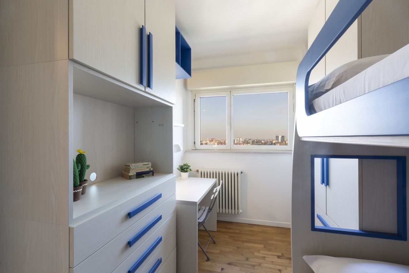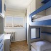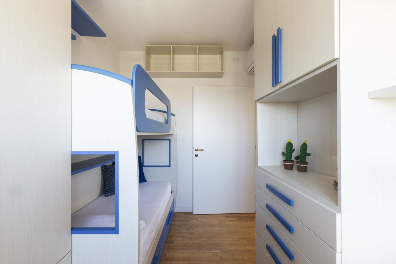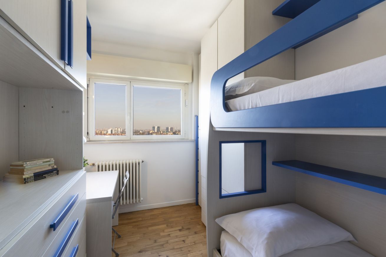 Seconda camera: arredata con un letto a castello con due letti singoli e cassetti inferiori, scrivania con lampada, armadio a due ante, cassettiera e tre ripiani alti. Anche qui è presente un’ampia finestra con vista panoramica.