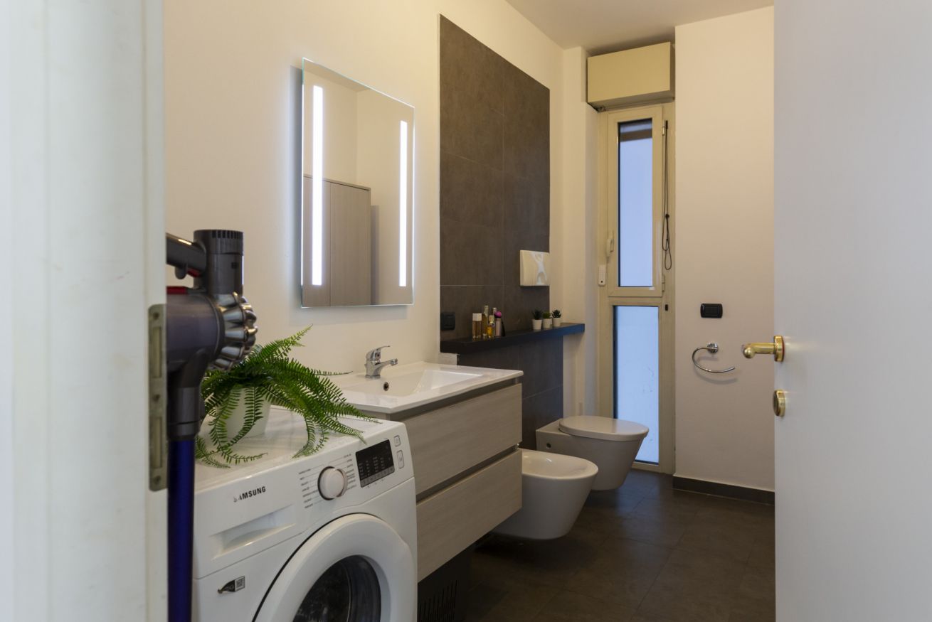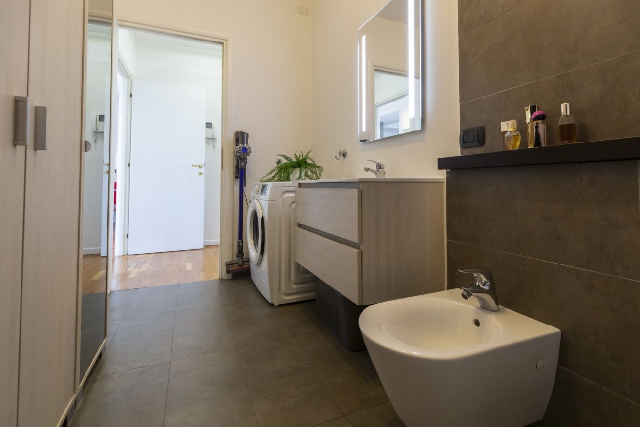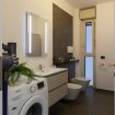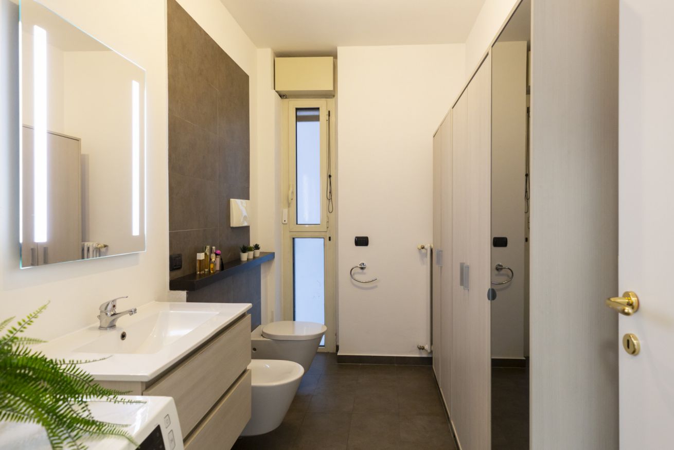 Secondo bagno: completo di servizi essenziali, lavatrice e un grande armadio a 5 ante (di cui una con specchio a figura intera) contenente prodotti per la pulizia, ferro e asse da stiro, aspirapolvere e stendibiancheria.
